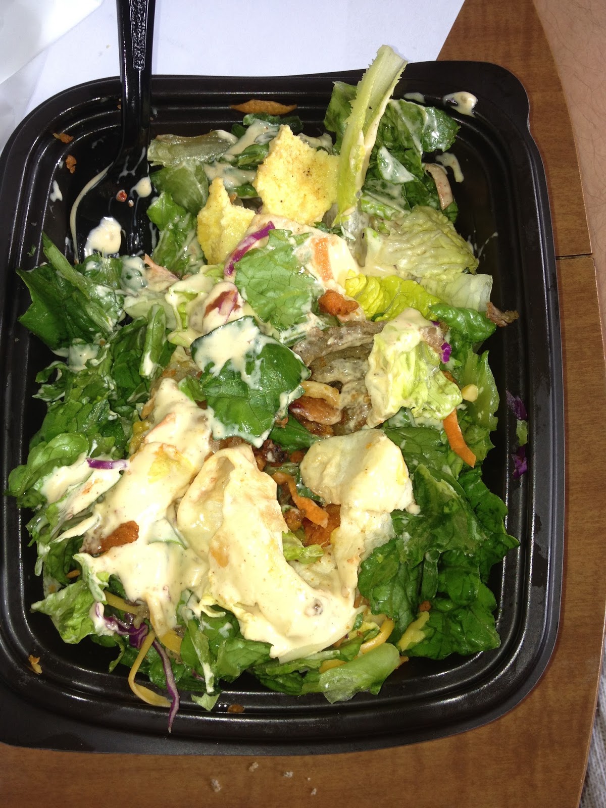 I decided to get a breakfast burrito from Sonic. The Steak & Egg burrito was always a tasty treat, so I decided to add it onto a salad. The combination was fairly good. I've never had scrambled eggs in my salad before, but it was still just as a good as a boiled egg. The steak was nicely marinated in whatever juices Sonic uses, and the cheese and tortilla also added a nice touch to the already tasty salad. I used a combination of the packet of salsa that came with the burrito and the Spicy Salad dressing from Chik-Fil-A. As it was described to me, the dressing is a lot like a chipotle ranch, but spicier. It was a good compliment to the salad. The only thing I would have changed was the softness of the tortilla. I wish I could have baked it a bit to add a bit more crunch.
